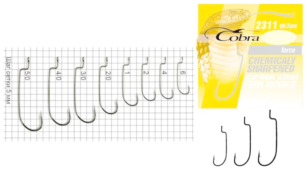 Назва бренду Cobra відображає безкомпромісність цих гачків. Як і смертоносна змія, ці гачки не залишать шансів своєї здобичі. Лінійка включає в себе кілька модифікацій. Тут представлені офсетніки, позначені індексом CO501. Виконані вони з міцного сталевого дроту. Пряме жало з найгострішим заточуванням істотно підвищує шанси риболова на успішну підсічку. Борідка під час виведення не дає хижакові зійти. Підчеп округлий. Ніжка подовжена, на ній можна надійно зафіксувати довготілу силіконову приманку. У верхній частині - характерна для гачків цієї категорії сходинка. Кріплення до оснащення здійснюється за допомогою невеликого вушка.