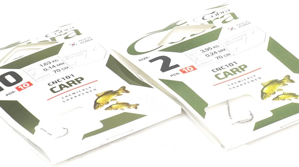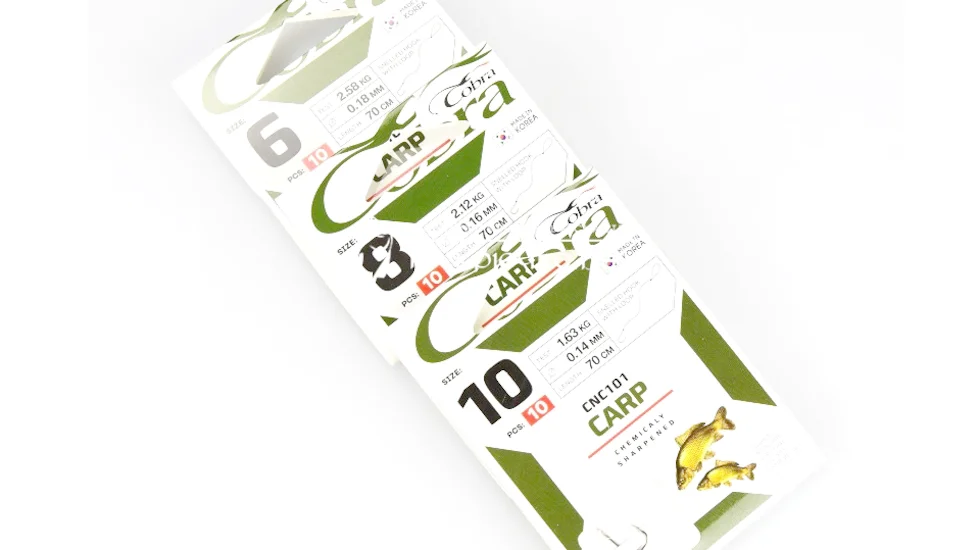 Для того, щоб спростити і прискорити складання монтажу, розробники бренду Кобра пропонують одинарники з індексом CNC101. Гачки оснащені повідцем, довжина якого 70 см. Діаметр і, відповідно, розривне навантаження волосіні підібрані за розміром одинарника. А основною цільовою рибою для даної серії одинарників буде вибагливий короп і його родичі. Виконано Cobra CNC101 з міцної високовуглецевої сталі. Мають ножку середньої довжини, досить широкий підчеп і злегка загнуте кінчиком вістря всередину жало. Хімічна заточка забезпечує необхідну проникаючу здатність. Допомагає утримати клюнувшу рибу борідка. Кріплення повідця до гачка здійснюється за допомогою лопатки.