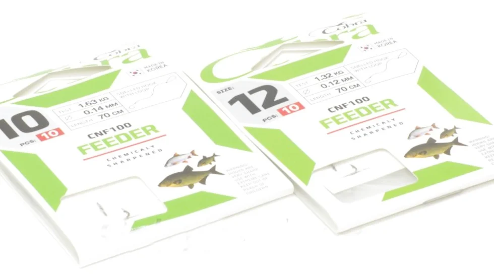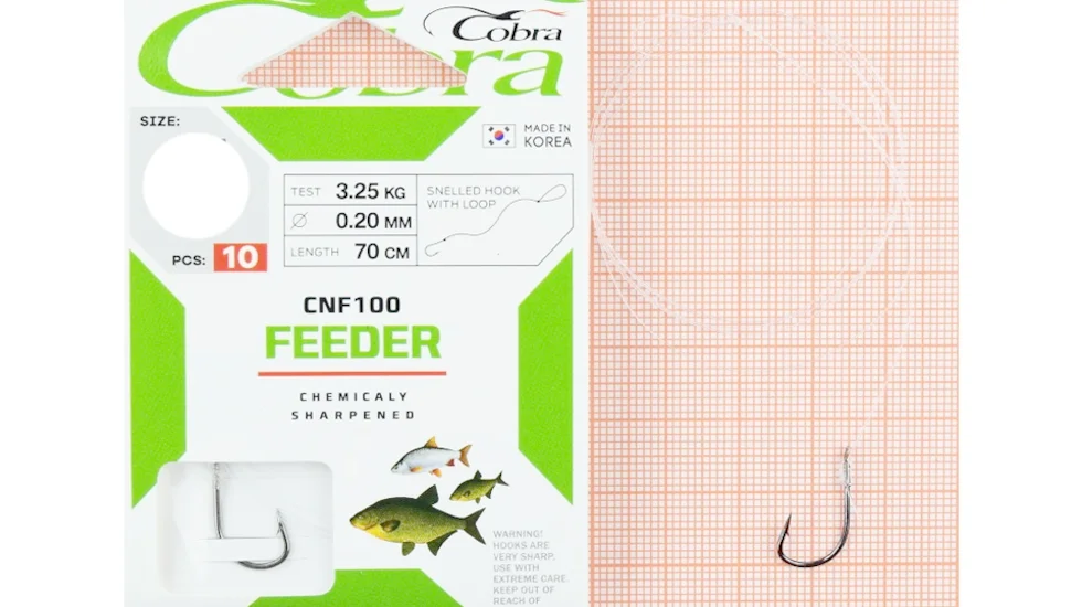 Для того, щоб спростити і прискорити монтаж, експерти бренду Кобра пропонують лінійку одинарників Feeder з індексом CNF100, оснащених повідками в розмотуванні 70 см. Діаметр волосіні і, отже, її розривне навантаження підібрані відповідно до розміру гачка. Призначена серія для лову на фідерну снасть. Моделі мають недовгу пряму ніжку, широкий підчеп, коротке жало. Геометрія продумана для кращого зачепу. Жало піддалося хімічному заточуванні. Борідка на ньому допомагає утримати клюнувший трофей. Для необхідної міцності гачки лінійки Cobra Feeder CNF100 виготовлені з високовуглецевої сталі. Вони не деформуються і не зламаються при виведенні норовистого трофея. Кріплення до повідця здійснюється за допомогою лопатки.