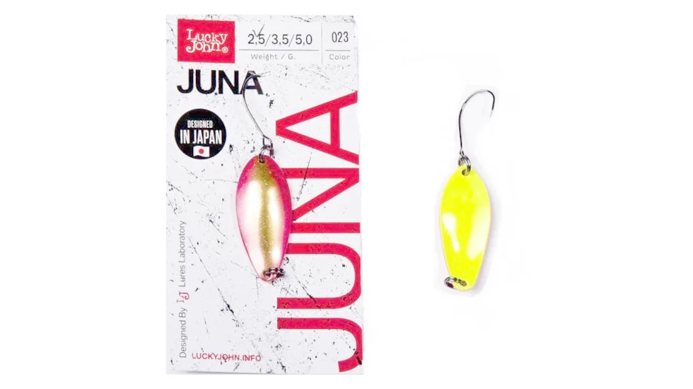 Уловиста форелева блешня Juna від торгової марки Lucky John найефективніше грає на повільній рівномірній проводці. Безбородий одинарник дозволяє застосовувати цю блешню для спортивного лову. "Колебалки" мають перевірену округлу опуклу форму, яка приваблює своїми рухами не тільки форель, але і окунів, головнів, невеликих щук. Довжина мініатюрної Juna 30 становить 3 см., а вага - 2,5 гр. Великий асортимент забарвлень дозволяє підібрати таку блешню, яка буде доречна в ваших умовах лову. Присутні двоколірні моделі, яскраві або темні приманки, моделі з блискітками.