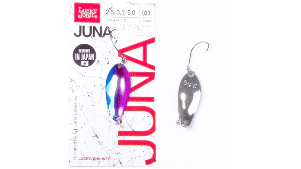Уловиста форелева блешня Juna від торгової марки Lucky John найефективніше грає на повільній рівномірній проводці. Безбородий одинарник дозволяє застосовувати цю блешню для спортивного лову. "Колебалки" мають перевірену округлу опуклу форму, яка приваблює своїми рухами не тільки форель, але і окунів, головнів, невеликих щук. Довжина мініатюрної Juna 30 становить 3 см., а вага - 2,5 гр. Великий асортимент забарвлень дозволяє підібрати таку блешню, яка буде доречна в ваших умовах лову. Присутні двоколірні моделі, яскраві або темні приманки, моделі з блискітками.