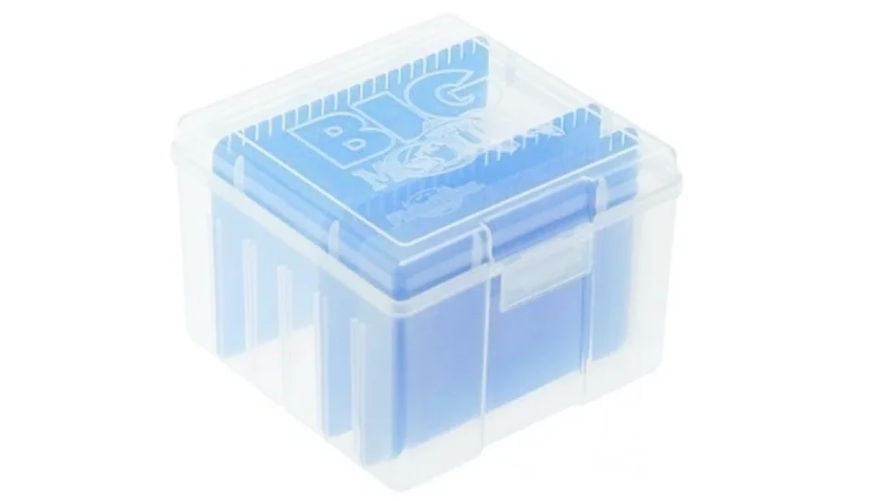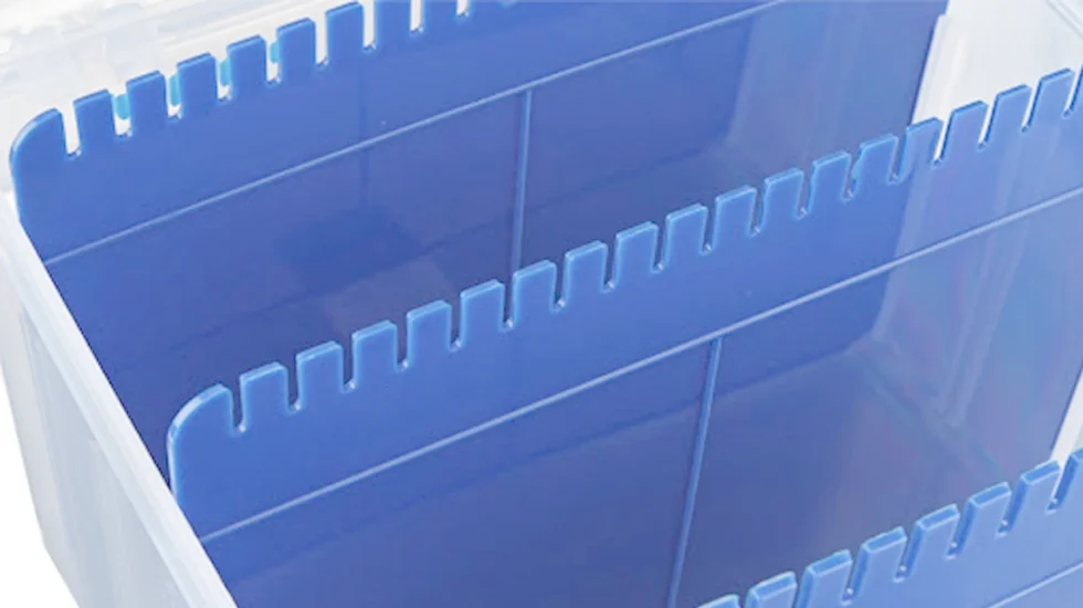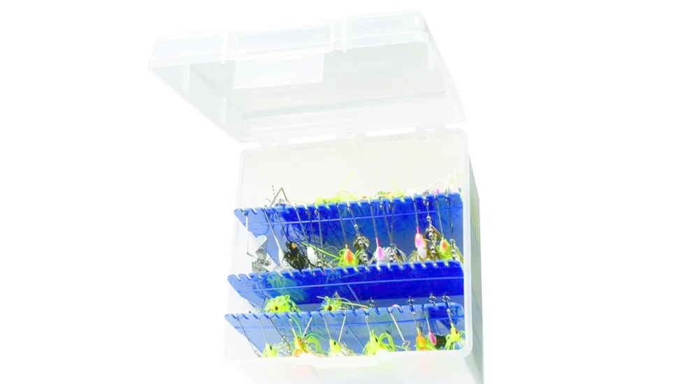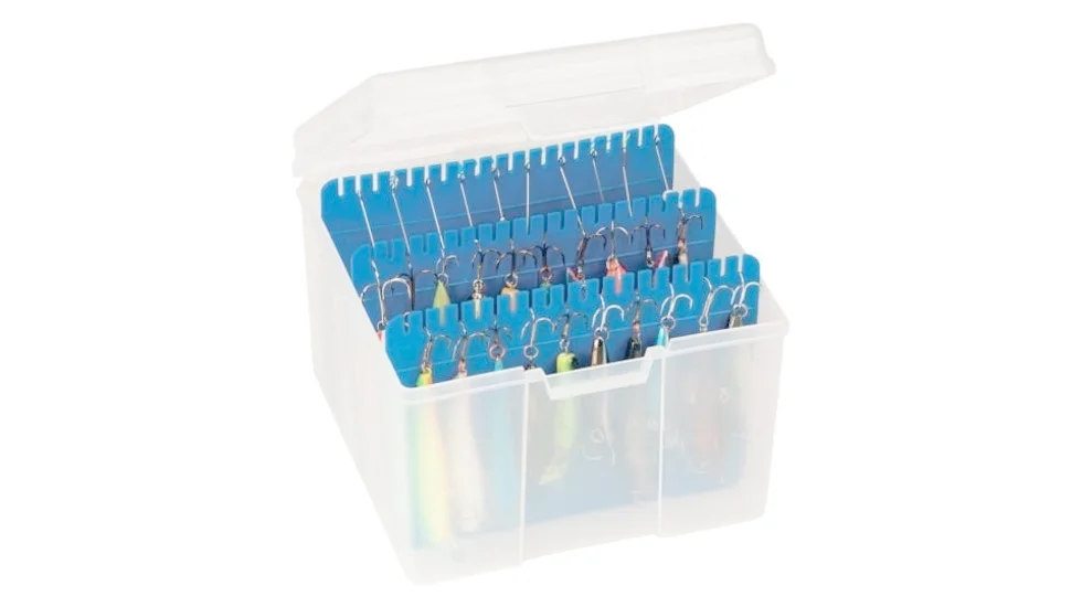 Містка коробка для зберігання спінербейтів. Виготовлена з прозорого пластика з внутрішньою обробкою полімером Zerust, який не дозволяє утворюватися корозії на металевих елементах. Є можливість перевстановлення перегородок.