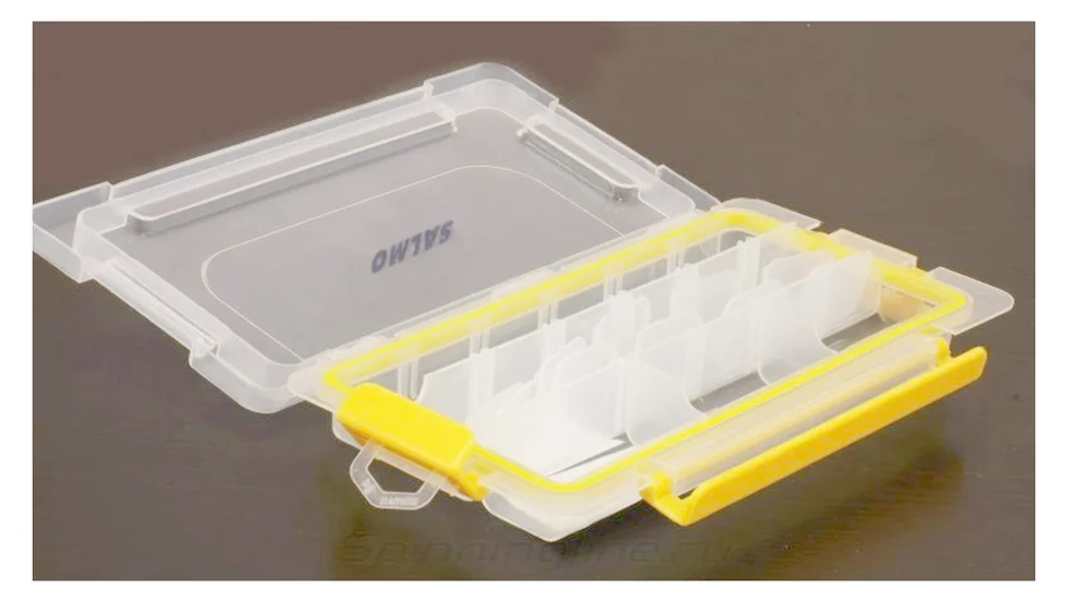 Коробочка водонепроникна з пересувними перегородками середньої величини і невеликою глибиною всередині. 3 горизонтальних відсіка і 10 зйомних роздільників.