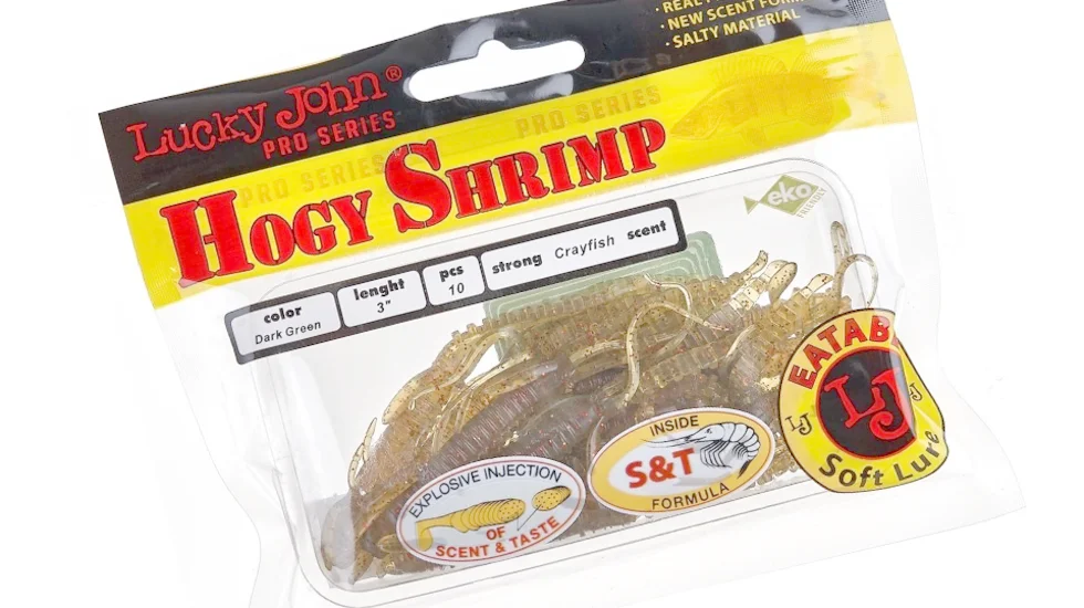 Безліч вусиків і відростків різних форм і розмірів відповідають за дратуючу гру Hogy Shrimp 76. Приманка підходить для солоних і прісних акваторій. Модель пасивна, вимагає активної анімації з ривочками, підкидами і короткими паузами. Візуально модель схожа на ракоподібні. Для більшої реалістичності експерти Lucky John просочили тіло Hogy Shrimp 76 спеціальним складом зі смаком і ароматом раку. Навіть вибагливий хижак не захоче випльовувати таке апетитне "частування" після клювання. Довжина моделі 7,6 см, вага 1,95 гр. У прісній воді розробники рекомендують її для судака, цікавого окуня, щуки. Приманка добре працює на класичній джиг-голівці, відвідному повідку, каролінському оснащенні.
