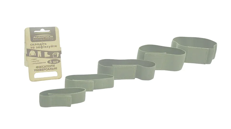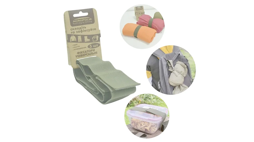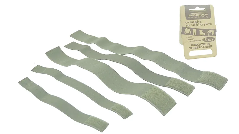 Практичний набір еластичних стрічок з текстильними застібками (липучками) для фіксації одягу, взуття, спорядження, підвішування сумок і чохлів. Ідеальний аксесуар для туристів, рибалок, мисливців, кемперів та всіх, хто веде активний спосіб життя.