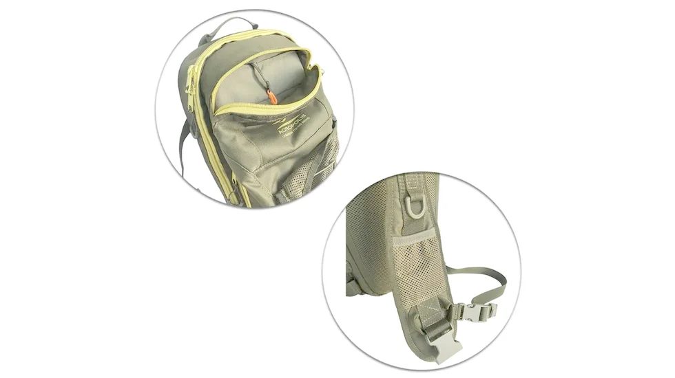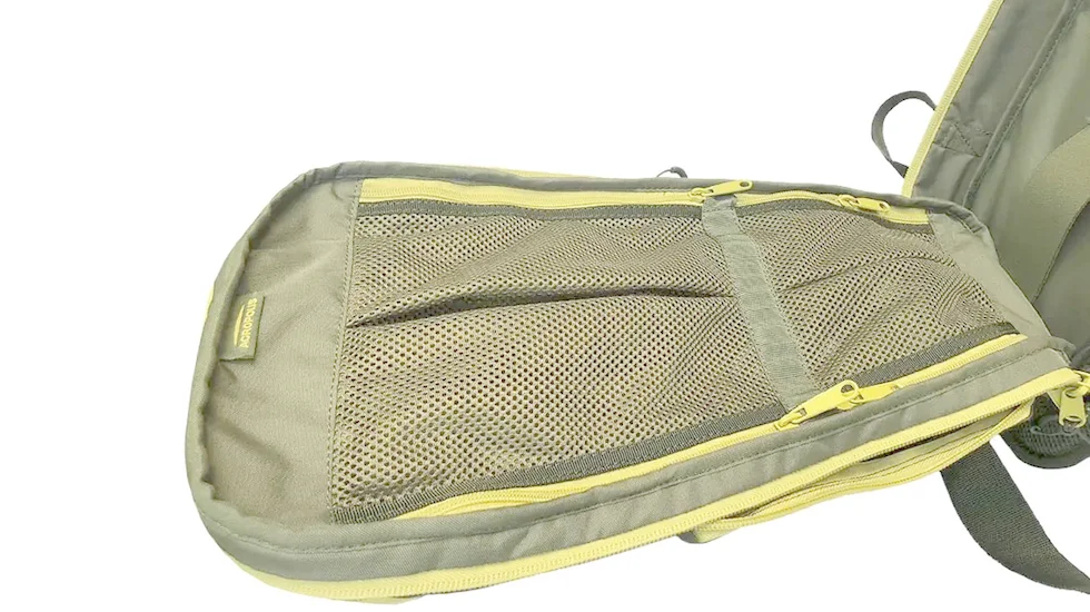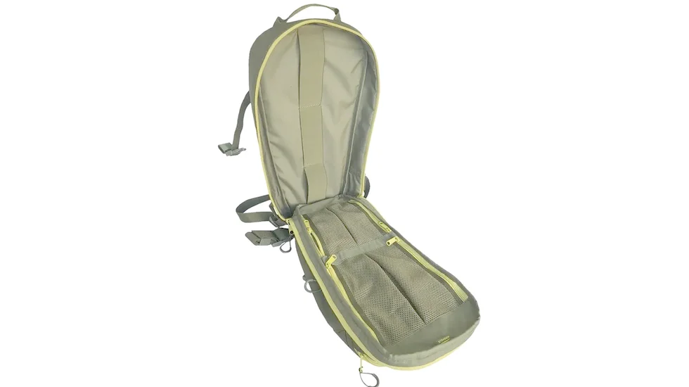 Центральне відділення відкривається повністю, а допоміжні кишені мають «дзеркальні» блискавки для зручного доступу з обох боків. Є відділення для особистих речей і їжі. Верхня кишеня для окулярів, ваг та інших дрібниць, а спереду — секція для пляшки з водою або одягу, що стягується гумкою.