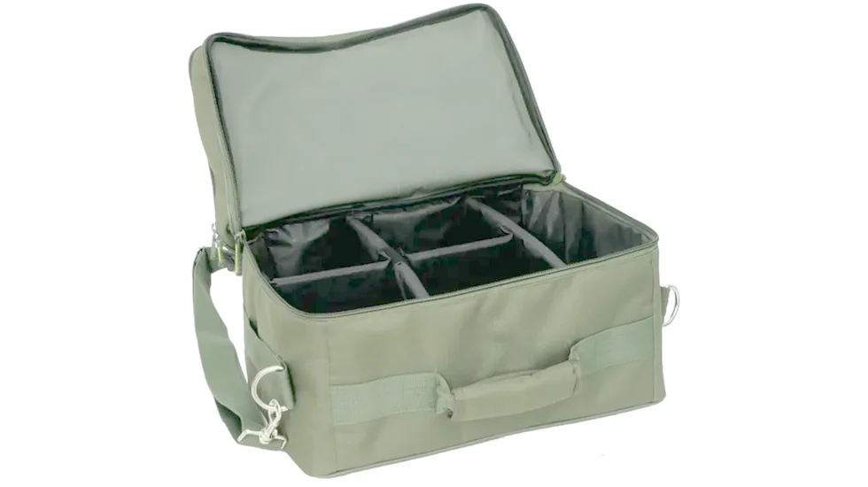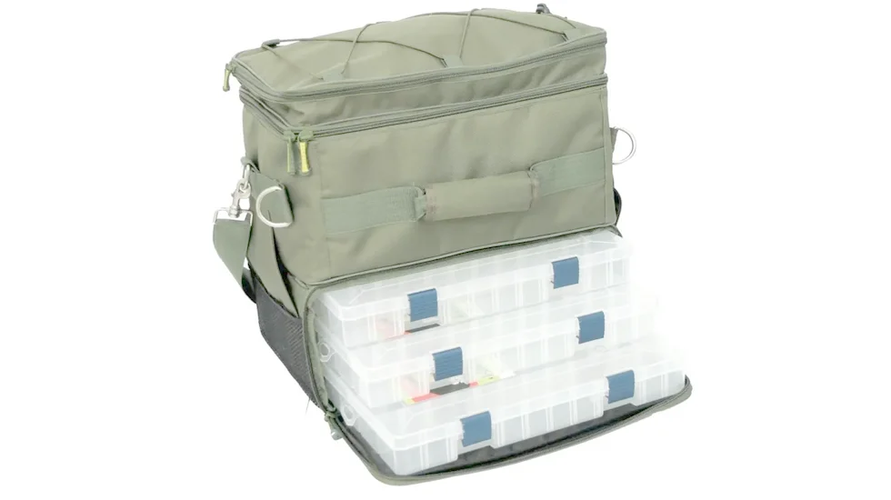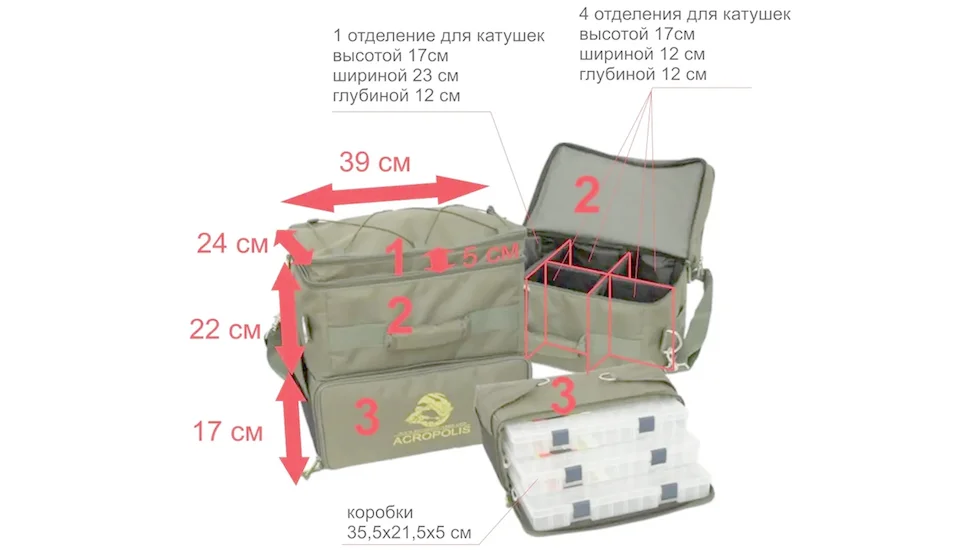 Нижня частина сумки комплектується трьома великими прозорими коробками для снастей, знімними перегородками для регулювання розміру відсіків під воблери, джерки, силіконові приманки тощо. Коробки можна легко витягти, перетворивши сумку на універсальну для інших цілей. Металеві карабіни на боках забезпечують зручність перенесення сумки на плечі.
