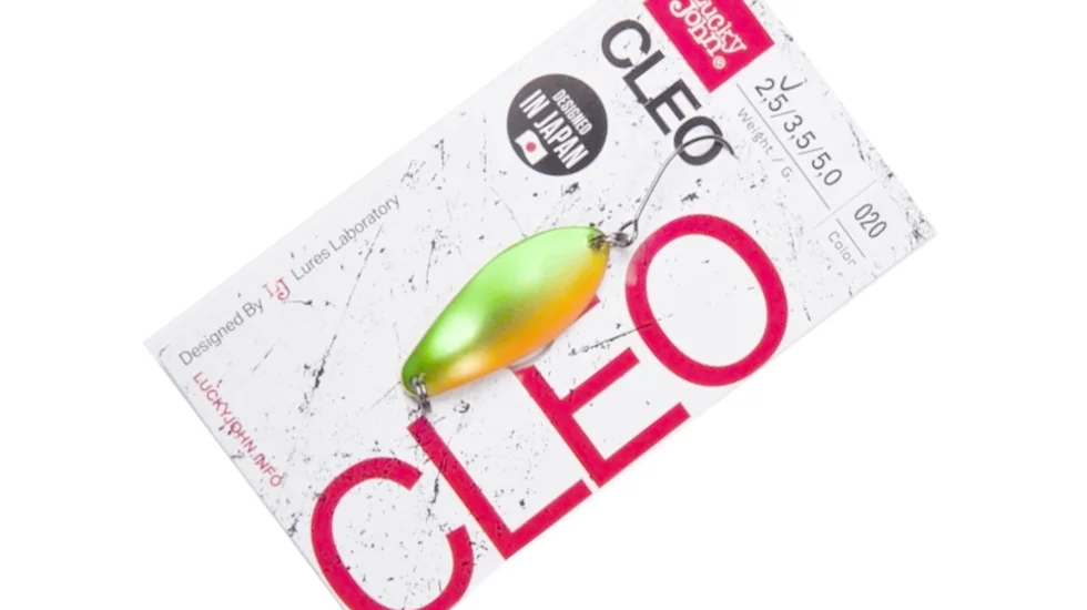 Лінійка блешень Cleo від фірми Lucky John призначена для форелевої риболовлі. Ця колебалка володіє якісним покриттям, яке відблискує при проводці. Ці відблиски на відстані привернуть увагу примхливої форелі. Геометрія самої блешні продумана для яскравої гри і хороших польотних якостей. Навіть при проводці в неквапливому темпі ця колебалка демонструє дуже активну гру, тому вона може розворушити і пасивну рибу. Довжина представленої модифікації складає 3,1 см., а важить вона 2,5 см. Для прихильників риболовлі за принципом «зловив-відпусти» дуже важливим плюсом даної приманки є те, що одинарний гачок не має борідки.