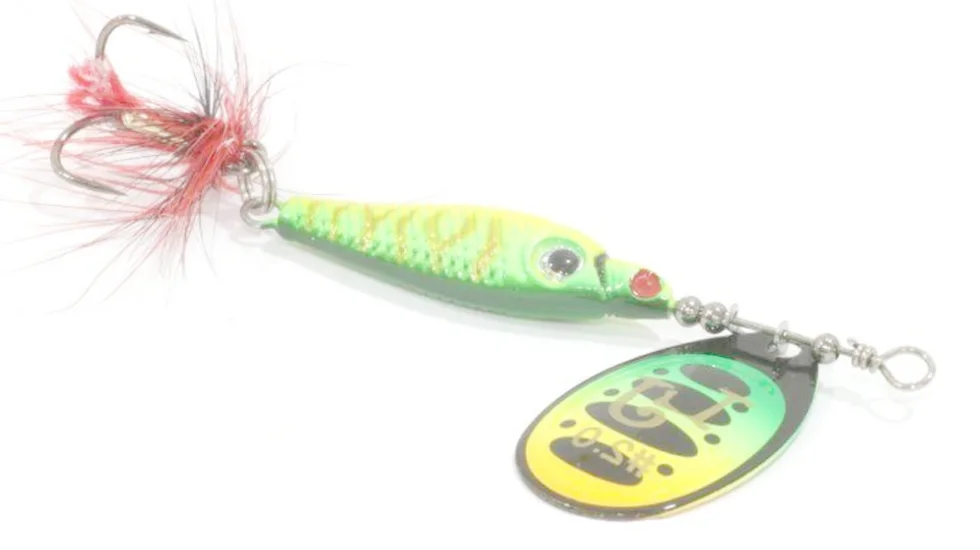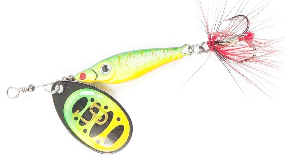 Серія обертових блешень Trian Blade Round від фірми Lucky John є класичною приманкою для лову хижака на спінінг. Ці вертушки мають дуже надійну, стабільну гру, що робить їх привабливою мішенню для атаки будь-якого хижака, що мешкає в наших водоймах. Легка обертова пелюстка виконана з латуні і має відмінні динамічні дані при русі у воді. Демонструє стійкі обертання незалежно від швидкості і способу анімації. "Заводиться" відразу після початку проводки. Кут відхилення пелюстки оберталки в робочому стані близько 60 градусів, що дозволяє використовувати блешню Lucky John Trian Blade Round для лову на спокійних водоймах. Пелюстки Trian Blade Round пофарбовані з двох сторін різними кольорами, що ще більше стимулює інтерес хижака до приманки. Сердечник має аеродинамічну форму, що дозволяє знизити ризик перекручування шнура під час проводки. Цей елемент виконаний з важкого сплаву, що значно збільшує дальність закидання блешні Trian Blade Round. Також для збільшення привабливості приманки трійник оснащується яскравою мушкою.