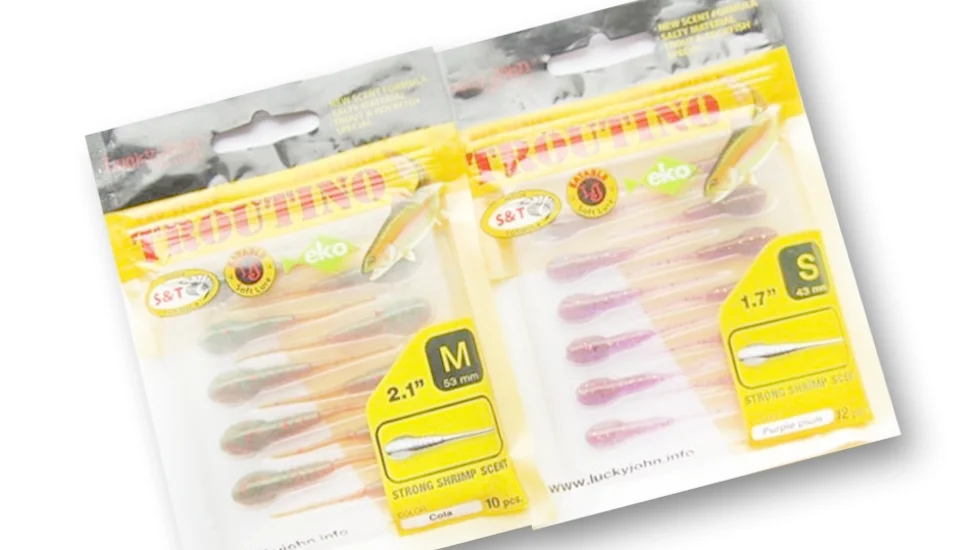 Беззахисний пуголовок буде легкою здобиччю як для хижаків, від всеядного ротана до примхливої форелі, так і для мирних видів риби. Модель Troutino 53 своїм зовнішнім виглядом і грою при проводці імітує цей кормової об'єкт, тому може вважатися універсальною. Довжина слага становить 5,3 см, вага 0,57 гр. На ступінчастій анімації, підкидах або простому ворушінні кінчиком вудилища тоненький рухливий хвостик у даній приманці звивається, спокусливо коливається. Для більшої привабливості експерти Lucky John просочили Troutino 53 стійким атрактантом з насиченим ароматом креветки. Еластичний матеріал не втрачає своїх властивостей навіть на холоді, тому слаг можна застосовувати цілий рік. Приманка добре підійде для мікроджига, може використовуватися для рознесених оснасток. Велика кількість колірних рішень дозволяє вибрати варіант для конкретної здобиччі і умов.