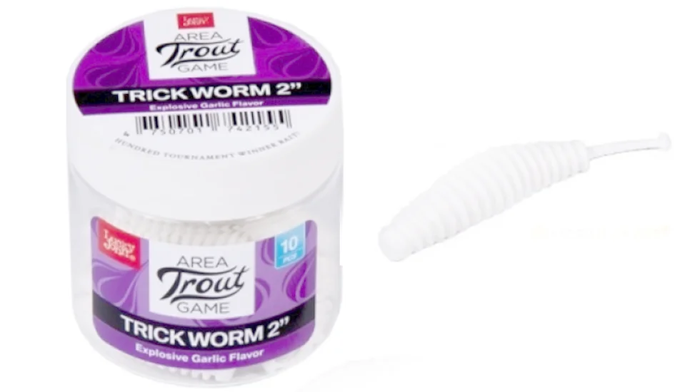 Компанія Lucky John розробила нову програму для любителів лову ставкової форелі. Серія приманок Trick Worm входить в лінійку спеціалізованих форелевих приманок. Крім риболовлі на прісноводних ставках, ця модель може використовуватися для рокфішингового лову. Об'ємна приманка з ребристим тілом добре підходить для оснасток "дроп-шот", "джиг ріг", каролінських і техаських монтажів. Вона представлена в яскравих забарвленнях, традиційно використовуваних для форелевої риболовлі. Принади Trick Worm - "їстівні". Вони оброблені великою кількістю маслянистого атрактанта з насиченим запахом часнику. Принади упаковані в пластикові баночки з герметичною кришкою, які краще зберігають аромат атрактантів. У кожній банці - 10 шт.