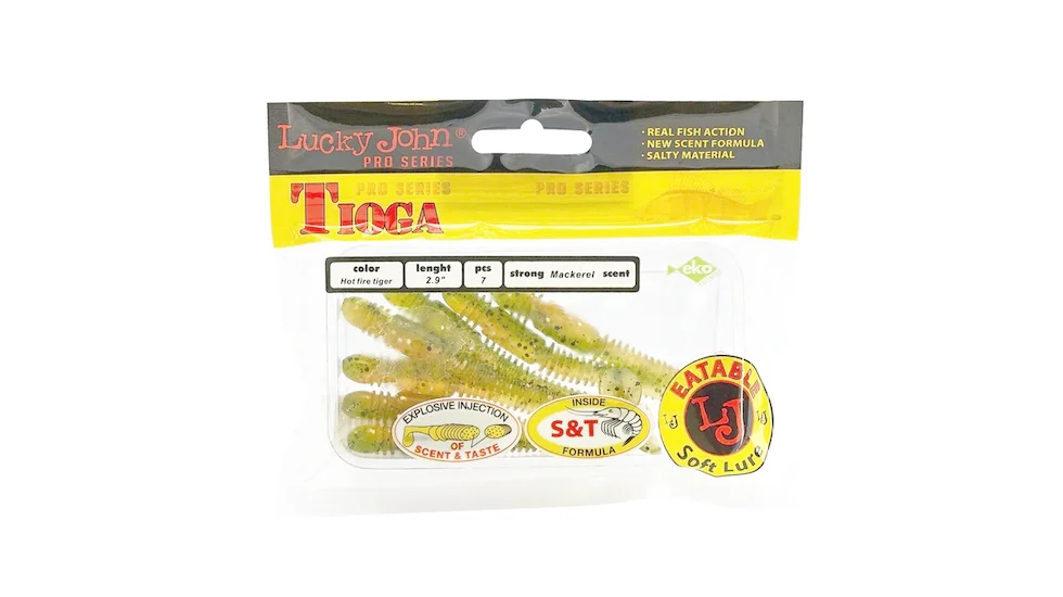 Хороша рухливість і жива інтенсивна гра - особливості моделі Tioga. Для цього експерти Лакі Джон наділили модель витягнутим з кільцевим рифленням тілом хробака і округлою п'ятою віброхвоста на плоскій тонкій підставі. Для більшої привабливості матеріал приманки містить склад Scent & Taste. Тому у воді Lucky John Tioga залишає за собою ароматний слід. Після клювання ця модель здається хижакові смачною, що змушує його довше тримати таке "частування" в пащі. Габарити моделі складають 7,5 см, а маса 2,5 гр. Приманку можна оснащувати одним, подвійним або офсетним гачком. Добре працює віброхвіст з джиг-голівкою або на рознесених монтажах. Розробники рекомендують довантаження від 3 гр до 10 гр, однак при полюванні на судака допустимо і більшу вагу. Крім ікластого хижака, серія сподобається і щуці, і всюдисущому окуню.