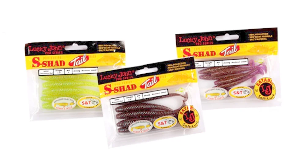 Вузькотілі рибки для судака - приваблива здобич. Цей кормовий об'єкт імітує своєю геометрією прогонистий віброхвіст моделі S-Shad Tail. Буква S в назві вказує на своєрідну, трохи вигнуту форму тіла приманки, яку експерти Лакі Джон придумали для красивої дражливої гри. Невелика п'ята своїми динамічними коливаннями при проводці забезпечує помітні збурювання середовища. Їх підсилюють гідроакустичні вібрації від поперечного рифлення. Команда розробників Lucky John підкреслює, що матеріал S-Shad Tail, по-перше, еластичний. Це сприяє більш природній грі. По-друге, міцний силікон переживе не одне клювання. І по-третє, містить усередині для смакових якостей сіль, а зовні оброблений маслянистим пахучим атрактантом. Ця речовина з насиченим ароматом макрелі міститься в герметичній упаковці. Тому запах можна "оновлювати" кожен раз після використання. Довжина даного віброхвоста 9,6 см, а маса 5,6 гр. Крім ікластого хижака, приверне він і щуку, і горбача-окуня.