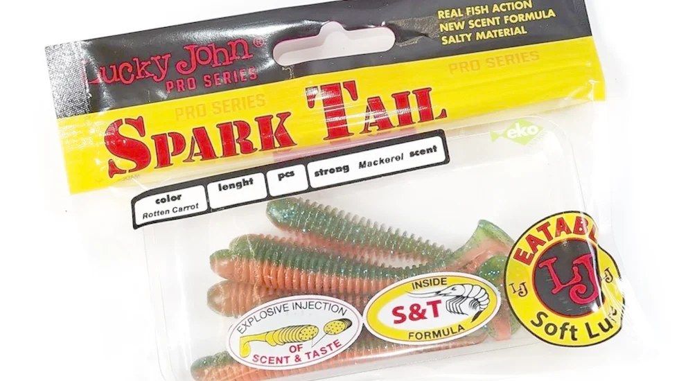 Віброхвіст з витягнутим тілом, покритим глибоким поперечним рифленням, і невеликим хвостиком з акуратною п'яточкою - це Spark Tail. Довжина даної моделі складає 10,1 см, а маса 4,32 гр. Коливання приманки добре привертають різних хижаків: судака, зубасту щуку і великих окунів. Модель виготовлена з їстівної гуми, тобто просякнута апетитними для риби атрактантами. Це змушує клюнувшу здобич довше утримувати частування в роті. Віброхвости від експертів Lucky John серії Spark Tail підходять для будь-яких монтажів. Завдяки м'ягкому, але міцному тілу, можуть використовуватися з подвійними, одинарними і офсетними гачками.