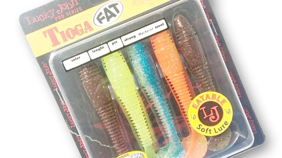 Збільшена, більш об'ємна геометрія витягнутого тіла Tioga Fat розроблена командою Лакі Джон для полювання на трофеї. Габарити приманки складають 10 см при вазі 8,95 гр. У порослих місцях її можна застосовувати на офсетнику без навантаження. Велика п'яточка на тонкому хвості створює потужні гідроакустичні вібрації, які підсилює глибоке поперечне рифлення тіла. Ребра надають моделі і велику рухливість. Експерти Lucky John просочили Tioga Fat складом до формули Scent & Taste Inside. Він наділяє модель ароматом макрелі і смаковими властивостями. Навіть після клювання риба не захоче випльовувати таке смачне "частування", що зручніше для підсічки. Спіймати з таким віброхвостом можна зубасту щуку, судака, сома і горбача-окуня.