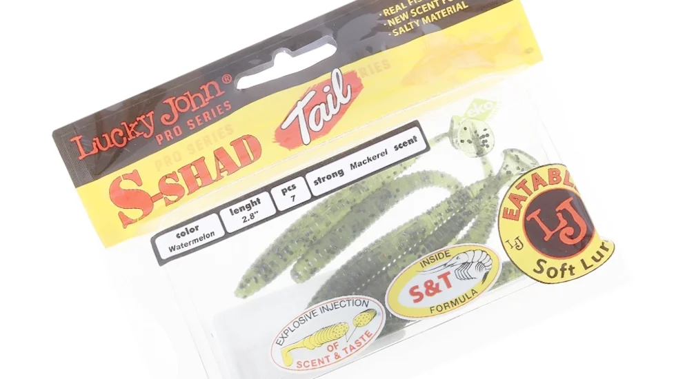Розробники продумали геометрію моделі S-Shad Tail 71 так, щоб вона в першу чергу сподобалася судаку. Крім того, вузькотілий віброхвіст з габаритами 7,1 см і вагою 2,2 гр приверне увагу зубастої щуки, а також всюдисущого окуня. Буква "S" в назві вказує на особливу "звивисту" форму, яку експерти Лакі Джон розробили для привабливої оригінальної гри. За динамічні коливання відповідає акуратна п'ята, а поперечне кільцеве рифлення по всьому тілу - за мікровібрації під час проводки. Фахівці Lucky John включили до складу еластичного матеріалу S-Shad Tail 71 солі, щоб надати йому насичений смак. А маслянистий стійкий атрактант, яким оброблена поверхня, має виражений апетитний аромат макрелі. Речовина міститься також в герметичній упаковці. Тому віброхвіст можна "оновлювати" кожен раз після використання, повертаючи в атрактант.
