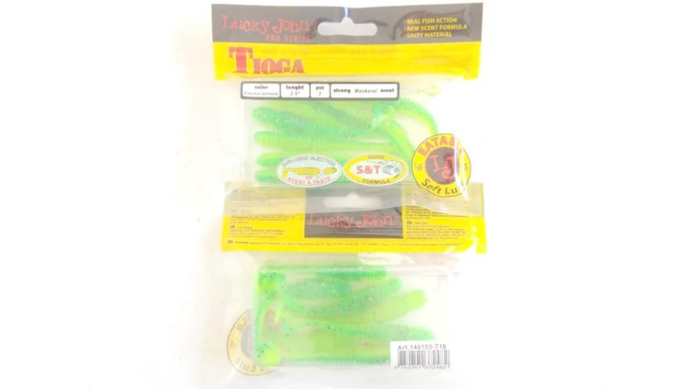 Хороша рухливість і жива інтенсивна гра - особливості моделі Tioga. Для цього експерти Лакі Джон наділили модель витягнутим з кільцевим рифленням тілом хробака і округлою п'ятою віброхвоста на плоскій тонкій підставі. Для більшої привабливості матеріал приманки містить склад Scent & Taste. Тому у воді Lucky John Tioga залишає за собою ароматний слід. Після клювання ця модель здається хижакові смачною, що змушує його довше тримати таке "частування" в пащі. Габарити моделі складають 7,5 см, а маса 2,5 гр. Приманку можна оснащувати одним, подвійним або офсетним гачком. Добре працює віброхвіст з джиг-голівкою або на рознесених монтажах. Розробники рекомендують довантаження від 3 гр до 10 гр, однак при полюванні на судака допустимо і більшу вагу. Крім ікластого хижака, серія сподобається і щуці, і всюдисущому окуню.
