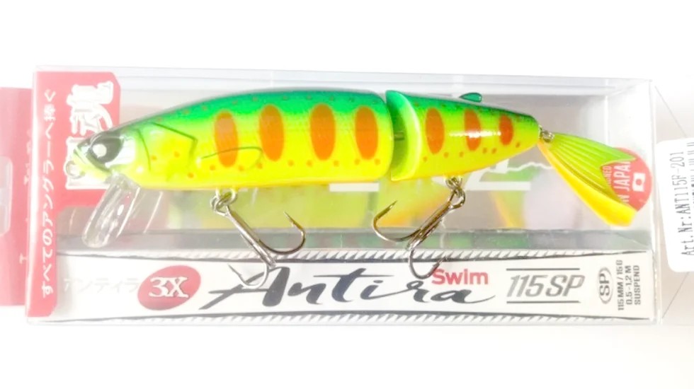 Воблери з сегментованою будовою володіють найбільш реалістичною грою, так як частини корпусу рухаються розкуто і природно. Модель Antira Swim F доповнена реалістичним хвостиком, що привертає увагу хижої риби. Гра приманки розкриється як на ривковій проводці невеликої інтенсивності, так і на равномірці. Робочий горизонт розташований на глибині 80 см. Цей воблер відмінно підходить для того, щоб обловлювати мілководні ділянки. Плавучість Antira Swim F позитивна. Під час паузи приманка піднімається вище горизонту проводки. Тому, щоб обійти зарості або перешкоду під водою, потрібно лише зупинити проводку. Довжина цієї приманки - 11,5 см при вазі в 14 гр. Цікавий яскравий дизайн не залишить воблер непоміченим в каламутній воді.
