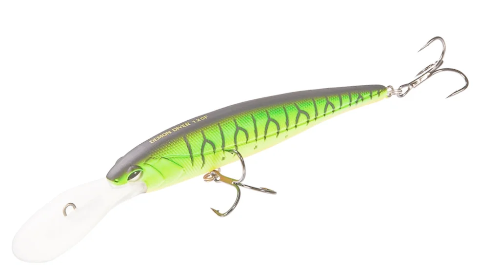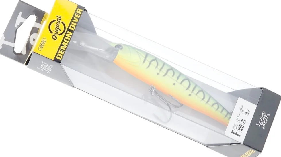 Для лову великого хижака, що мешкає на достатньо великій глибині, фахівці фірми Лаки Джон створили лінійку воблерів Original Demon Diver. Це міноу, які оснащені збільшеною лопаткою. Вона забезпечує занурення на 7 метрів. Щоб приманку можна було доставити в перспективну точку в водоймі, всередині корпусу прихована система далекого закидання. В якості проводки можна застосувати просту рівномірку або ж чергування потягувань і пауз. Такий спосіб отримав назву Стоп-енд-гоу. На паузах цей міноу буде підніматися вище свого робочого горизонту. Крім гри і реалістичного дизайну, воблер буде заманювати хижака ще й звуковими ефектами. Довжина Original Demon Diver дорівнює 12 см при масі в 21 гр. Дизайн зроблений дуже натуралістично. На корпус нанесено рифлення у вигляді луски, бічної лінії, очей.