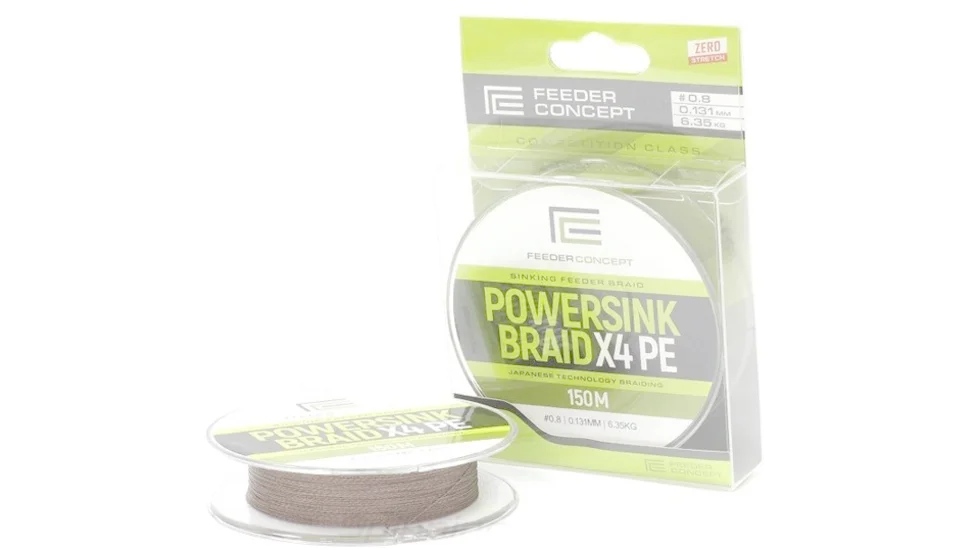Серія тонучих шнурів Feeder Concept Powersink створювалася для донного лову і фідерних оснасток. Вона підходить для лову як в теплий сезон, так і в зимовий час. Плетінка має чотирижильне плетіння, виконане особливим способом, який підвищує міцність шнура і його стійкість до абразиву. Поверхня шнура досить гладка, щоб забезпечити дальній кидок оснащення. Також Feeder Concept Powersink відрізняється нульовою розтяжністю і підвищеною чутливістю. Шнур виконаний в коричневому кольорі. Розмотування становить 150 м.