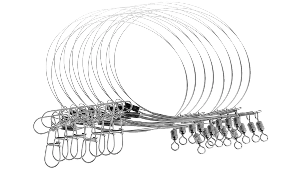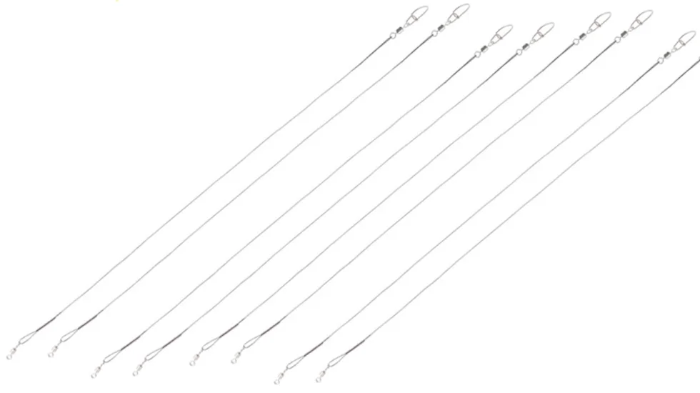 Набір повідків трьох розмірів. Надійні сталеві повідці для лову щуки. М'яке сталеве переплетіння з семи проводочків укладено зовні в нейлонову оболонку, а петлі повідця надійно зафіксовані синтетичною ниткою зі спеціальним просоченням. Повідці оснащені високоякісними вертлюгами (для з'єднання з основною жилкою) і вертлюгами з застібками (для кріплення приманки). Наявність двох вертлюг значно зменшує закручування волосіні. У наборі 3 розміри повідків: 15 см, 23 см, 30 см з тестом 6 кг. Кількість повідків в наборі - 72 штуки.